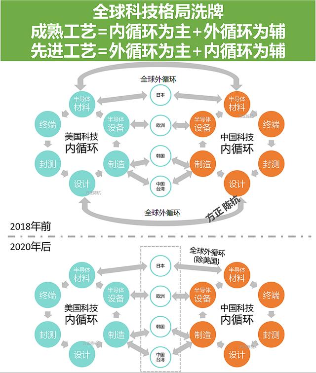 全球科技格局将重新洗牌,呈现逆全球化的返祖状态。即使强如美国也只参与了半导体产业的小部分环节,中、欧、日、美、韩、中国台湾,各自占据了产业链不可或缺的部分。