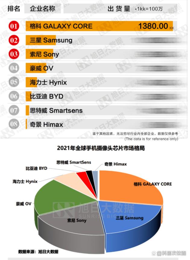 但需要清醒的看到格科微出货量占据全球第一,但出货量主要集中在中低端产品,高端产品与传统强企业索尼、三星仍然有差距。就拿2021年全球手机摄像头市场格局可见。
