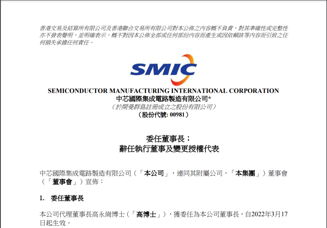 3月17日晚间,中芯国际(00981,HK)发布公告称,公司代理董事长高永岗博士,获委任为中芯国际董事长,自2022年3月17日起生效。周子学博士因身体原因,辞任公司执行董事职务,自2022年3月17日起生效。周博士已确认其与董事会并无意见分歧,亦无其他与其辞任执行董事职务有关之事宜须提请公司股东注意。