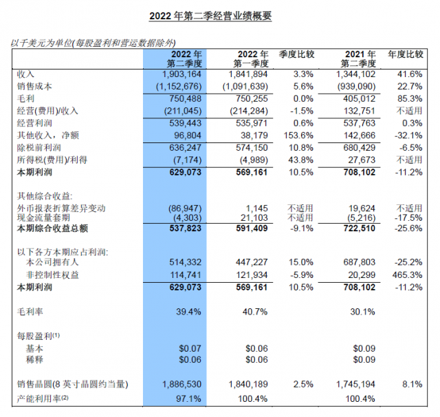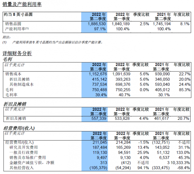 中芯国际管理层评论说:“今年二季度,公司销售收入突破19亿美元,环比增长3.3%,出货量以及平均销售单价均有小幅增长。产能利用率为97.1%,毛利率为39.4%。由于疫情对于人员流动的管控,部分工厂岁修并没有在二季度进行,使疫情对于产出的整体影响低于预期,因而当季收入和毛利率都略超指引。