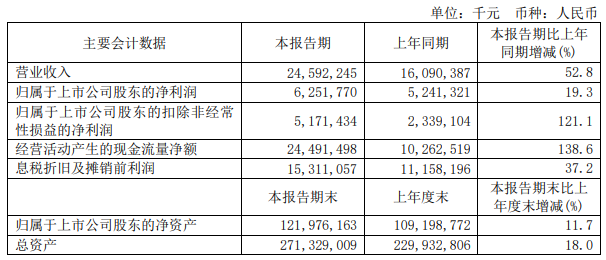 公司上半年净利润77.87亿元,同比增长52.88%;实现归属于上市公司股东的净利润62.52亿元,同比增长19.27%