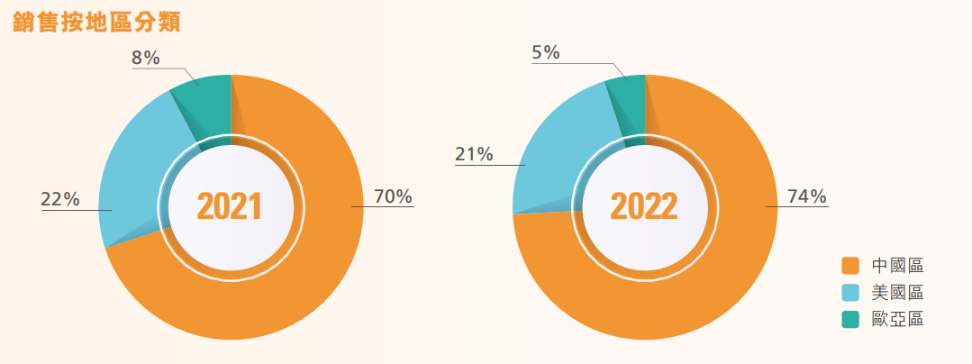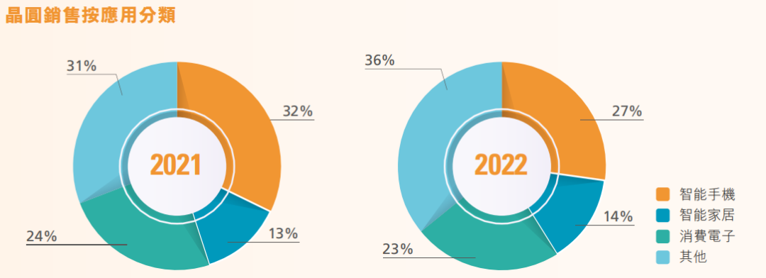 公司2022年业绩按产品应用划分的收入占比分别为:智能手机27%、智能家居14.1%、消费电子23%、其他35.9%;按区域划分来自中国区的营收达到74%;美国区的营收占比为21%,欧亚区占比为5%;按尺寸划分,12吋营收占比为67%,8吋占比为33%。