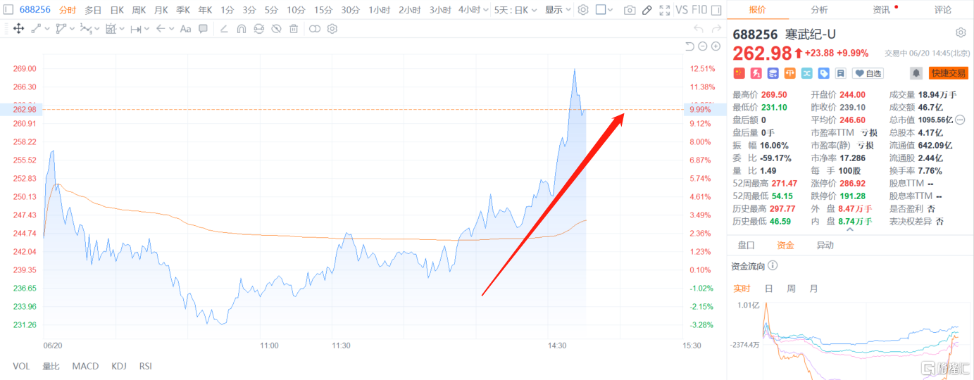 与之走势相反的是,尾盘芯片半导体板块异动拉升,其中寒武纪尾盘一度拉升超12%,截至发稿,仍涨近10%,成交额超47亿元。