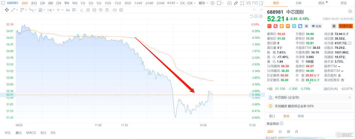 6月20日,中芯国际午后持续跳水,截至发稿,该股跌超5%,报52.21元,成交额超38亿元;此外中芯国际H股股价同步大跌超5%。