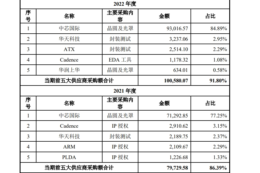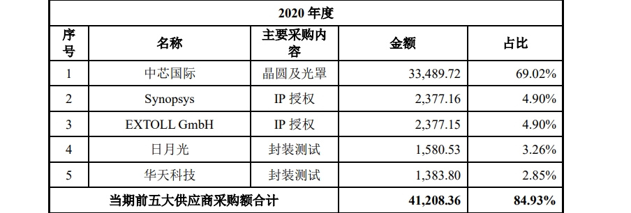 灿芯半导体为全球集成电路设计服务行业的头部厂商,目前已与中芯国际建立战略合作,系灿芯半导体的重要关联方,为第二大股东,同时也是第一大原材料供应商。近三年发行人向中芯国际的采购金额占当期采购总额的比例为69.02%、77.25%、84.89%,从七成增加到八成,依赖中芯国际过大,存在供应商集中度较高的情况。