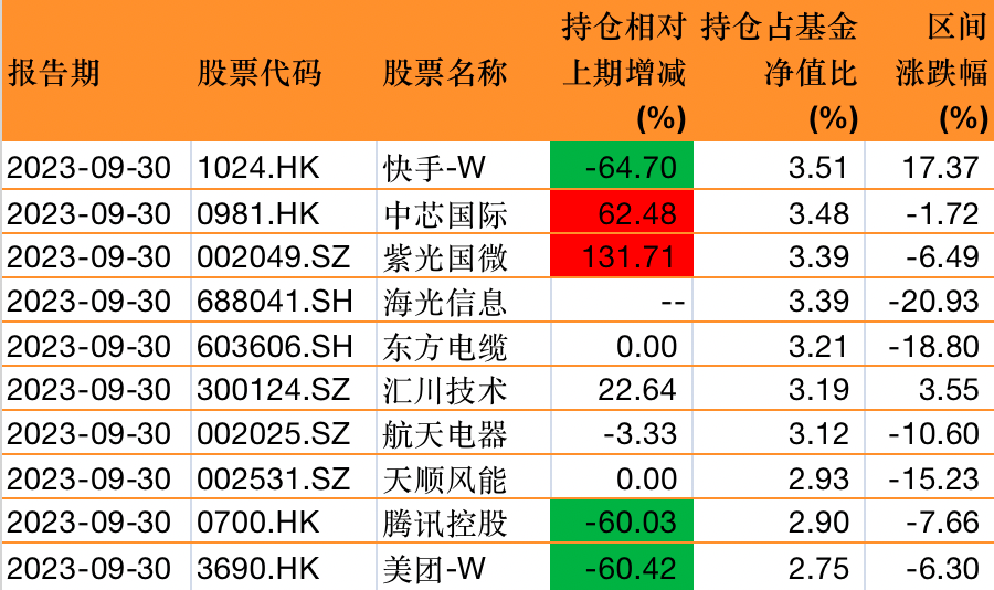 二季报中位列前三大重仓股的快手-W、腾讯控股、美团-W在三季度时遭到李晓星大幅减持,相对上期减仓幅度依次为64.70%、60.03%、60.42%。目前快手-W仍为该基金的第一大重仓股,而腾讯控股、美团-W则变更为第九大重仓股与第十大重仓股,占基金净值比也大幅下降。