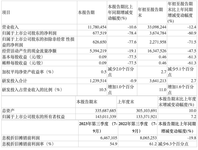 从单季财务表现来看,该公司第三季度收入实现117.80亿元,同比下滑10.56%,环比增长6.04%;归母净利润实现6.78亿元,同比下滑78.41%,环比减少51.78%;单季度扣非净利润为6.27亿元,同比下滑77.61%,环比下滑18.47%;毛利率为24.05%,环比增长1.91个百分点,净利率为9.55%。
