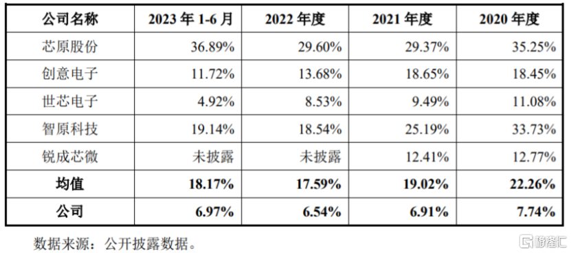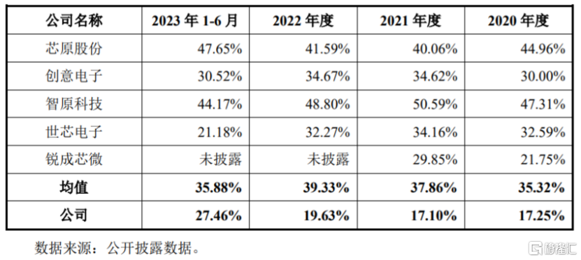 报告期内,灿芯股份的毛利率分别为17.25%、17.10%、19.63%、27.46%,明显低于同行业可比公司平均水平,主要系各可比公司芯片定制服务的业务领域、客户类型及经营规模均有较大差异。