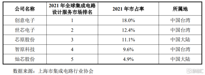 灿芯股份致力于为客户提供优质可靠的一站式芯片定制服务,公司积极参与全球竞争,吸引并服务了众多境内外客户,与安路科技、科华新创、星思半导体等公司建立了合作关系,在全球集成电路设计服务产业竞争中占据了重要位置。据上海市集成电路行业协会报告,2021年度公司占全球集成电路设计服务市场份额的4.9%,位居全球第五位。