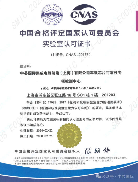 近日,中芯国际车载芯片可靠性专项检测中心通过中国合格评定国家认可委员会(CNAS)的认可评定,获得其授予的实验室认可证书和认可决定书。此次获认可证书将为公司持续快速推出车载工艺平台提供有力支持。