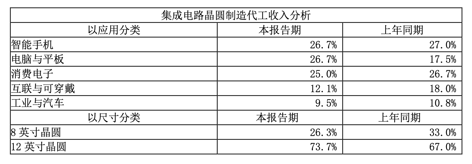 从代工产品应用分类看,智能手机业务占比26.7%,较上年略有下滑;电脑和平板占比为26.7%,较上年同期17.5%有大幅增加;消费电子为25%,上年同期为26.7%;互联与可穿戴占比12.1%,上年同期为18%,工业与汽车占比为9.5%,上年同期为10.8%。