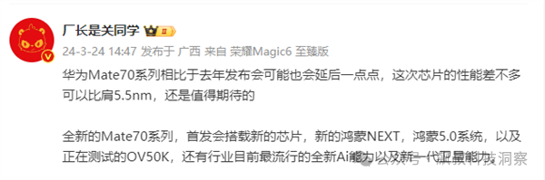 再加上下半年Mate 70系列发布日期的临近,根据知名数码博主“厂长是关同学”爆料,华为全新的Mate 70系列首发会搭载新的芯片,芯片的性能差不多可以比肩5.5nm。
