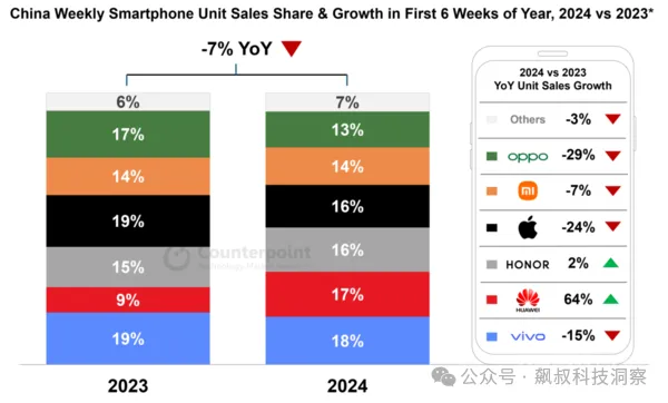 Research最新发布的中国智能手机周度销售追踪报告显示,2024年头六周中国整体智能手机销量同比下降7%,苹果、OPPO 和 vivo