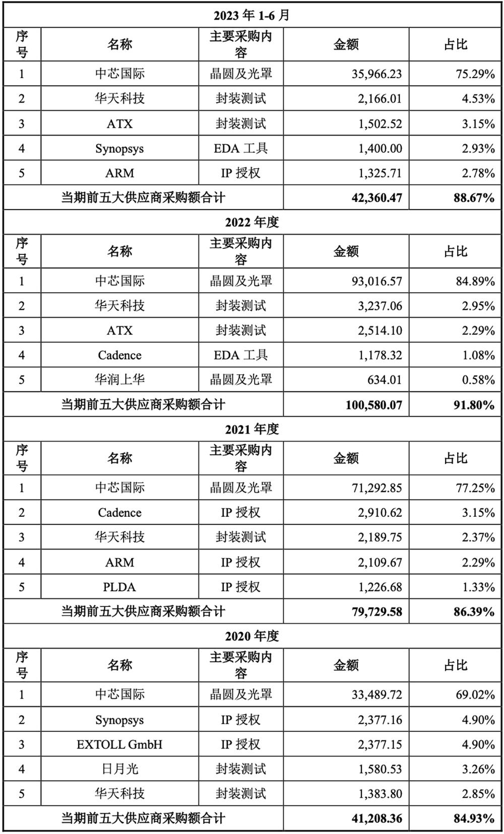 灿芯向前五大供应商采购内容主要为晶圆及光罩、封装测试与IP授权等。