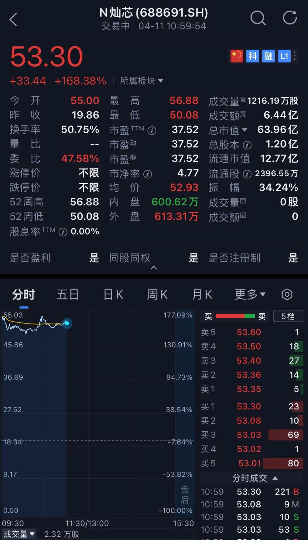 其发行价为19.86元/股,发行市盈率为25.12倍,股价开盘上涨177%到55元/股。截至11点,灿芯股价最高达56.88元/股,涨幅为186%,最新市值64亿元。