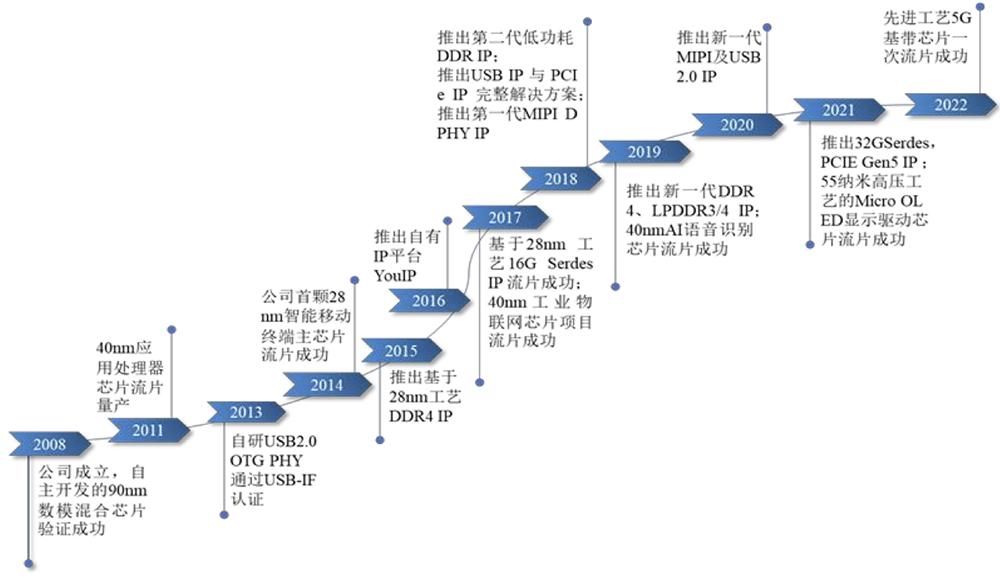 2010年,灿芯与中芯国际达成战略合作,次年灿芯第一颗40nm芯片在中芯国际一流片量产,2015年首颗28nm智能移动主芯片流片成功,2019年40nm AI语音识别芯片流片成功,2022年先进工艺5G基带芯片一次流片成功。