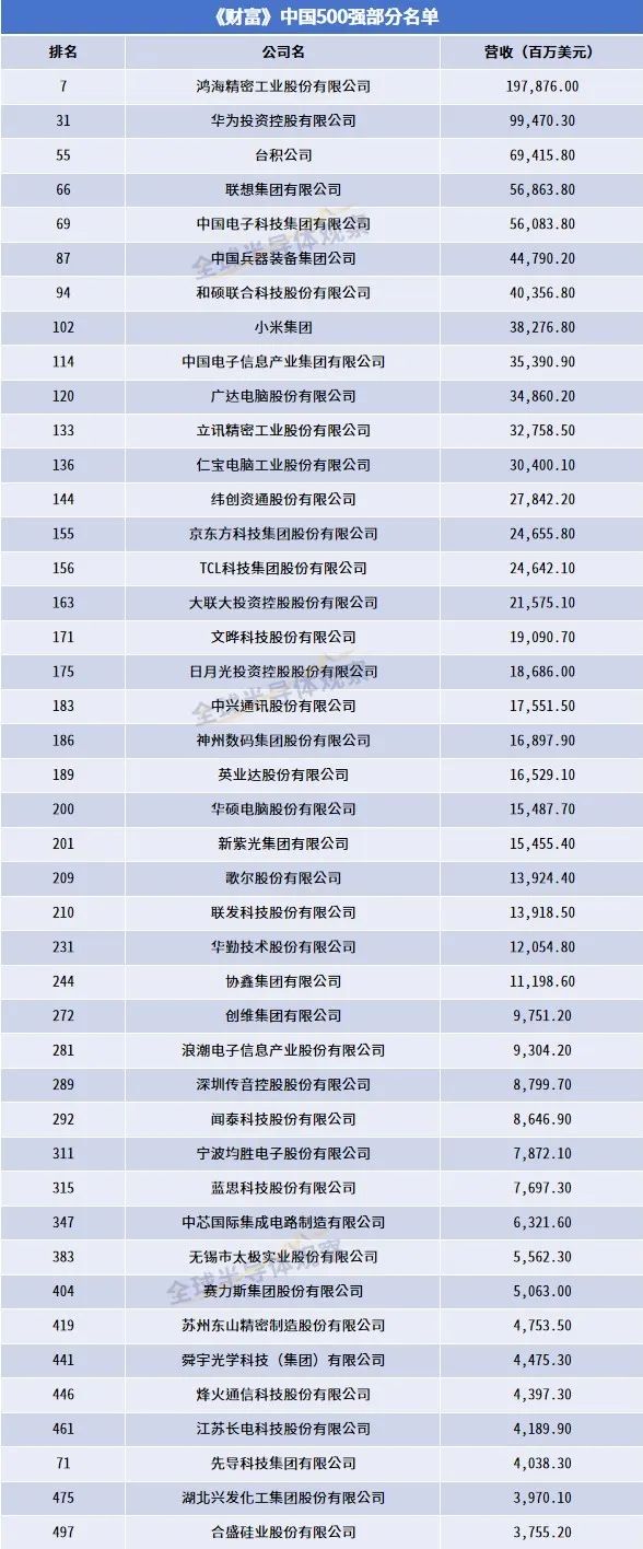 近日,财富中文网发布了2024年《财富》中国500强排行榜。据全球半导体观察不完全统计,在此次排行榜中,有多家半导体企业及多家手机、电脑等终端消费电子厂商上榜。