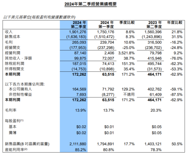 具体来看,中芯国际二季度晶圆销量达到211万片,环比增长17.7%,同比增长50.5%。销量的显著增长与收入增长的相对滞后表明,平均单价有所下降。通过简单的计算可以知道,当前中芯国际的每片晶圆平均单价约为900美元,较一季度下降近8%。其中,8英寸晶圆占比的提升是导致平均单价下降的一个因素。