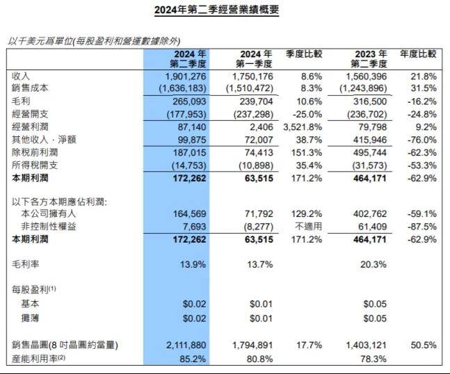 中芯国际近期公布的2024年第二季度财报显示,尽管净利润同比下降超过60%,仅为1.72亿美元,但这已是连续两年下滑后的新挑战。然而,在半导体行业历经两年的下行周期及外部环境的重重封锁后,中芯国际的财务状况透露出一些积极的信号。