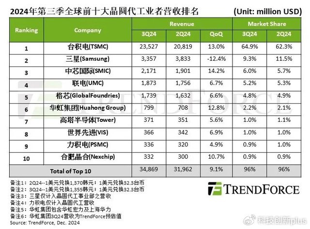 再看市场,按照2024年3季度的数据(这是机构公布的最新数据,没有4季度的),台积电拿下了全球64.9%的市场份额,全球第一。