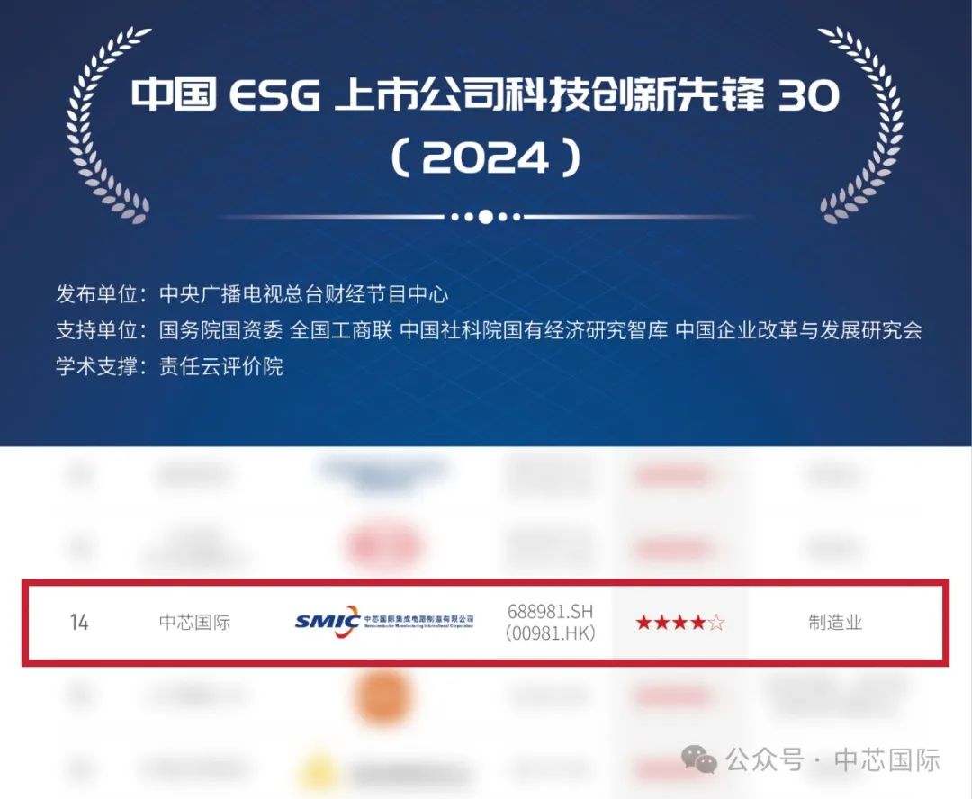 近日,中央广播电视总台《科技创新ESG行动报告(2024)》(下称《报告》)正式对外发布。《报告》从A股与港股6471家上市公司中,筛选出237家科技属性较强的企业作为研究评价对象,最终遴选出30家企业进入“中国ESG上市公司科技创新先锋30(2024)”榜单。中芯国际凭借近年来优异的科技创新及ESG表现成功入选榜单,位列第14位。
