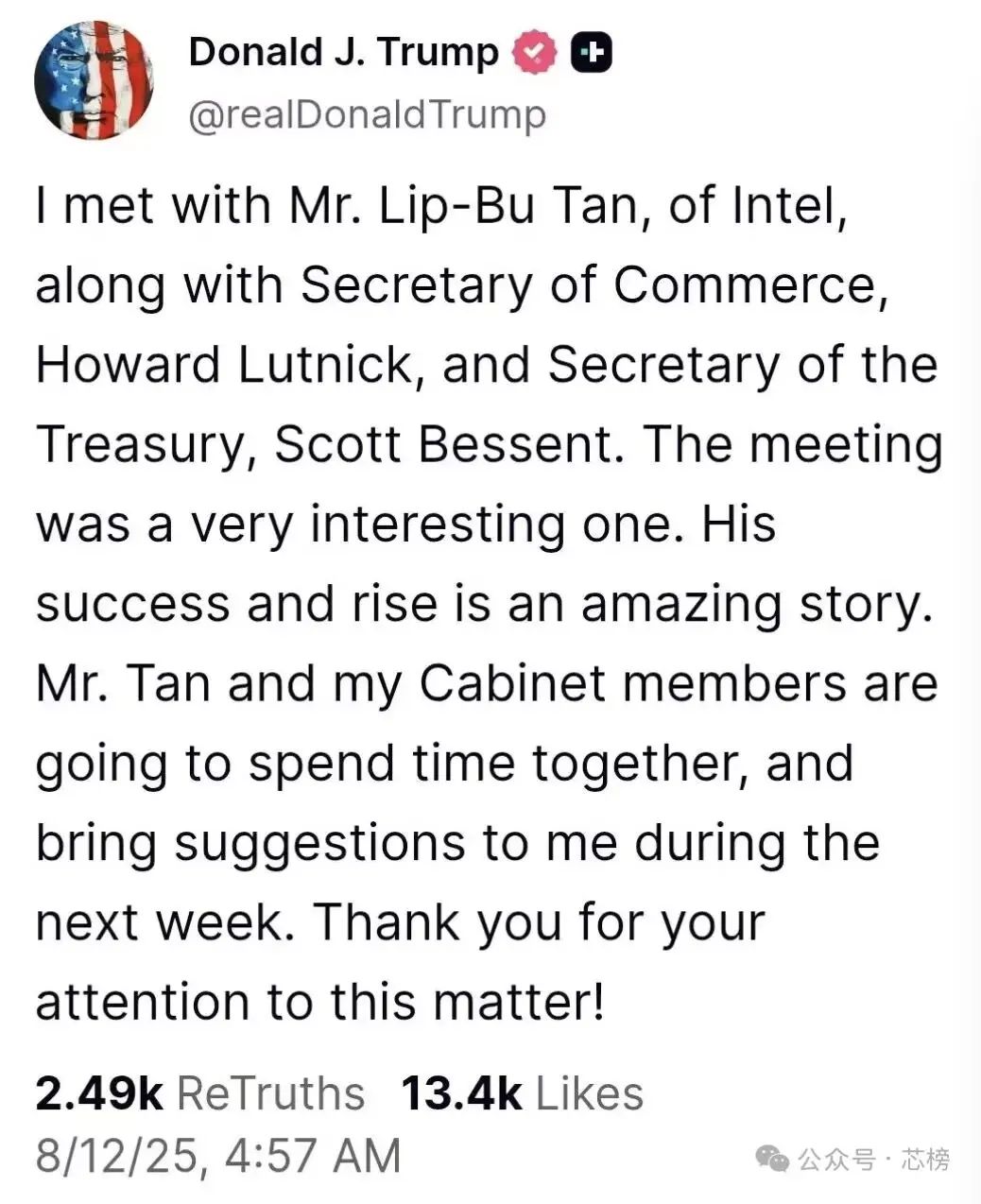 2025 年 8 月 7 日,美国总统特朗普在社交媒体上发难:"英特尔 CEO 陈立武存在严重利益冲突,必须立即辞职!"这记突如其来的政治惊雷,让刚上任五个月的陈立武瞬间被推上风口浪尖。