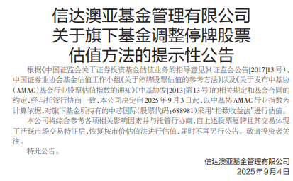 公告称,经与托管行协商一致,公司决定自2025年9月3日起,以中基协AMAC行业指数为计算依据,对旗下基金所持有的中芯国际(股票代码:688981)采用“指数收益法”进行估值。