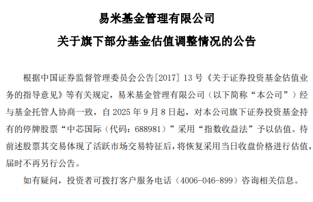 公告称,易米基金管理有限公司经与基金托管人协商一致,自2025年9月8日起,对该公司旗下证券投资基金持有的停牌股票“中芯国际(代码:688981)”采用“指数收益法”予以估值。待前述股票其交易体现了活跃市场交易特征后,将恢复采用当日收盘价格进行估值,届时不再另行公告。