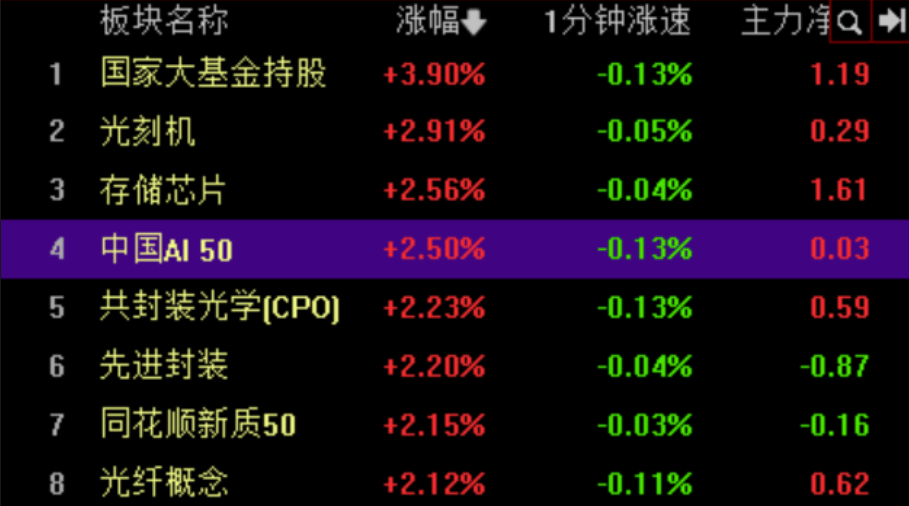 从盘中热点来看,国家大基金持股、光刻机、存储芯片等半导体细分板块涨幅居前。国家大基金作为半导体产业的重要投资力量,其持股板块涨幅达3.90%,显示出市场对大基金所投半导体项目的看好。光刻机板块涨幅2.91%,在半导体制造中,光刻机是核心设备之一,该板块的活跃反映出市场对半导体制造核心环节的关注。存储芯片板块也有2.56%的涨幅,随着数字经济的发展,存储芯片需求持续增长,行业发展态势良好。