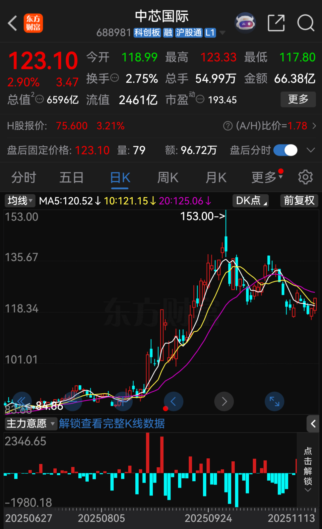 截至11月13日收盘,中芯国际A股股价报123.10元/股,涨幅为2.90%,总市值为6596亿元。