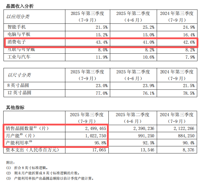 从晶圆应用领域来看,中芯国际2025年第三季度从消费电子、工业及企业获得的收入占营业收入比例分别为43.4%、11.9%,环比分别提升2.4个百分点、1.3个百分点。