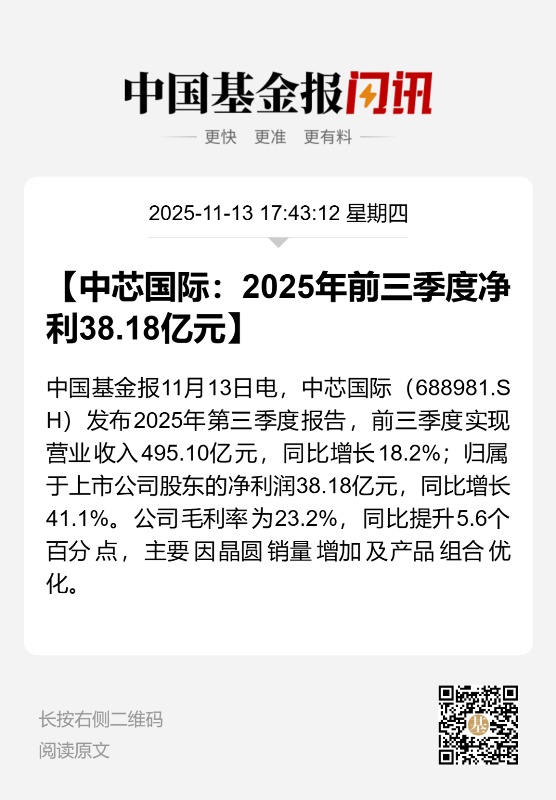 2025年前三季度,中芯国际的营业收入为495.10亿元,同比增长18.20%;归母净利润为38.18亿元,同比增长41.10%。