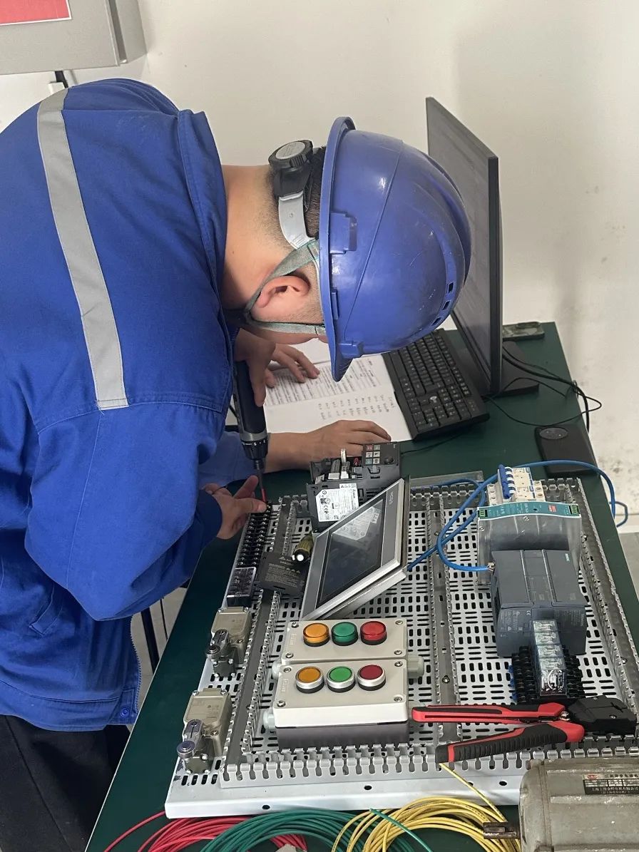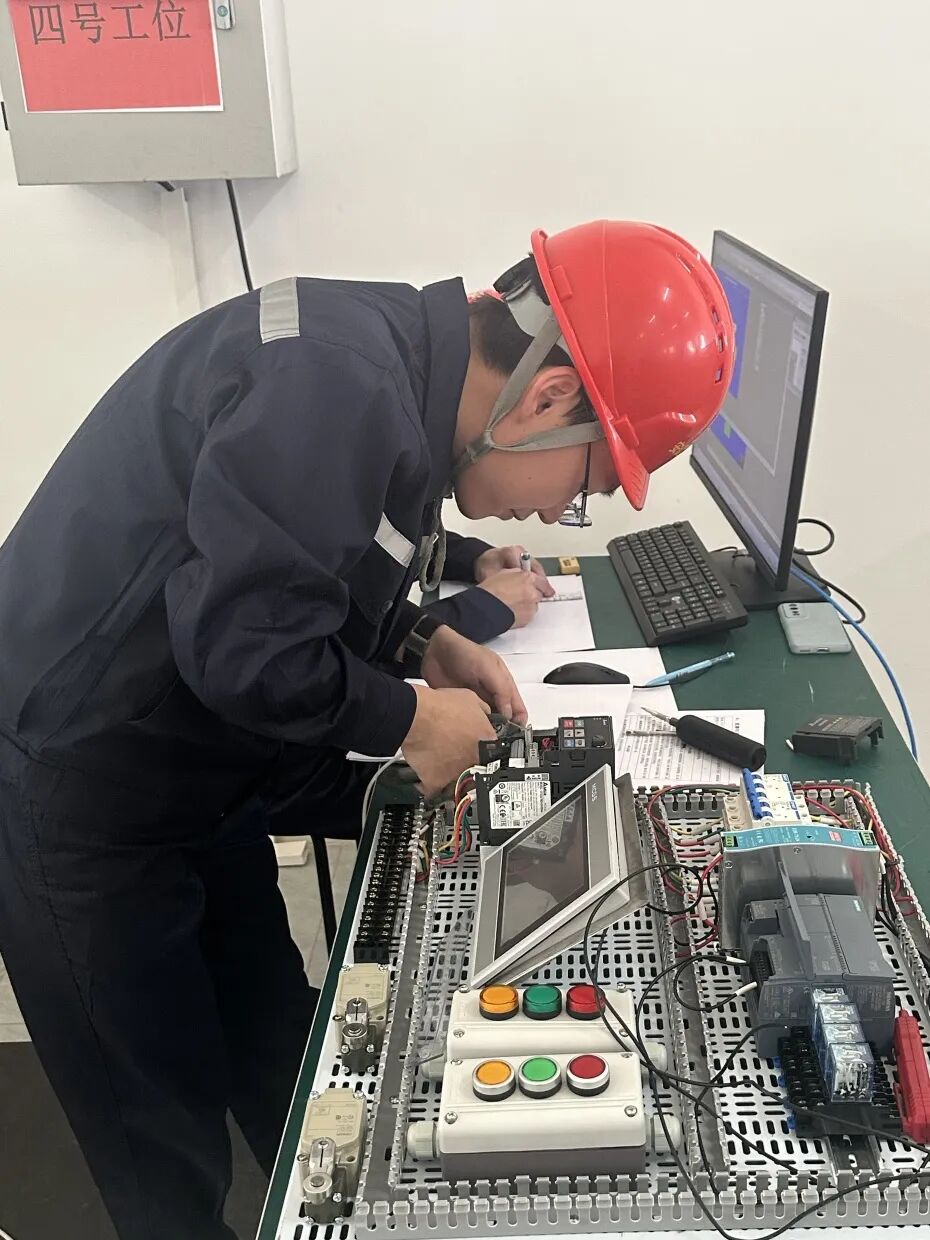 电工组竞赛同样紧张激烈。PLC控制盘的设计、安装、调试涉及多个复杂环节,选手们全神贯注,手指在键盘和设备上快速舞动,将专业知识与实践技能完美结合。团队成员紧密协作,共同攻克技术难题。