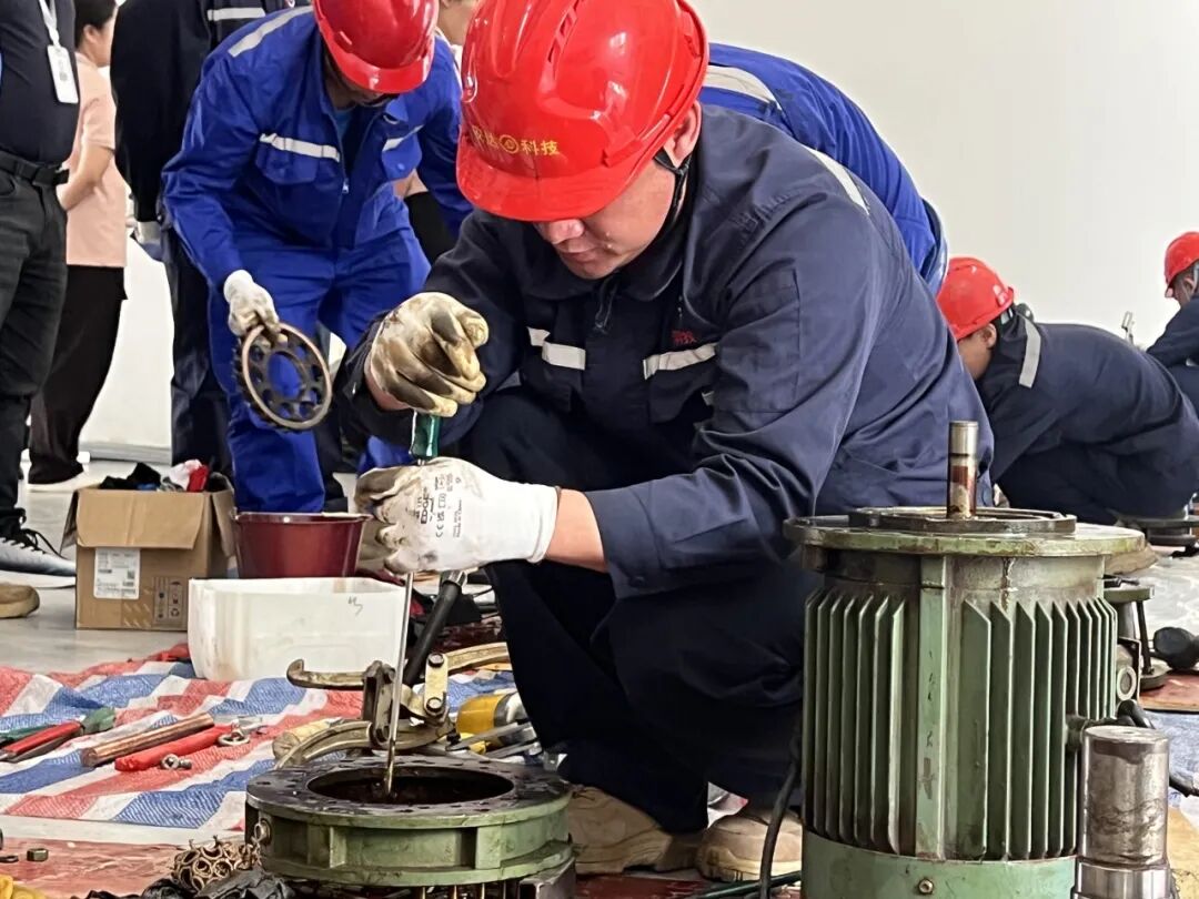 机修组赛场上,选手们迅速投入战斗。赛前准备严谨细致。拆卸环节,选手们手法娴熟,按规范流程精准操作;轴承游隙检查时,专注精准;装配过程中,团队分工明确、配合默契,面对问题沉着应对,迅速解决。