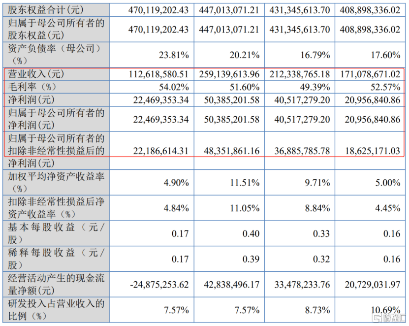 2019年至2022年1-6月各报告期,公司的营业收入分别为1.71亿元、2.12亿元、2.59亿元和1.13亿元,相应的归母净利润分别为2095.68万元、4051.73万元、5038.52万元和2246.94万元,业绩呈现小幅增长的态势。