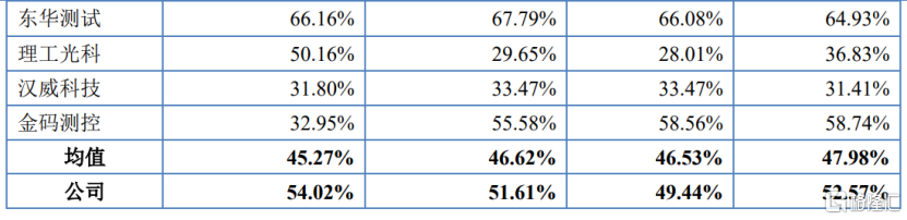 报告期内,公司的主营业务毛利率分别为52.57%、49.44%、51.61%和54.02%,呈现先降后升的态势,低于可比公司东华测试,高于汉威科技。