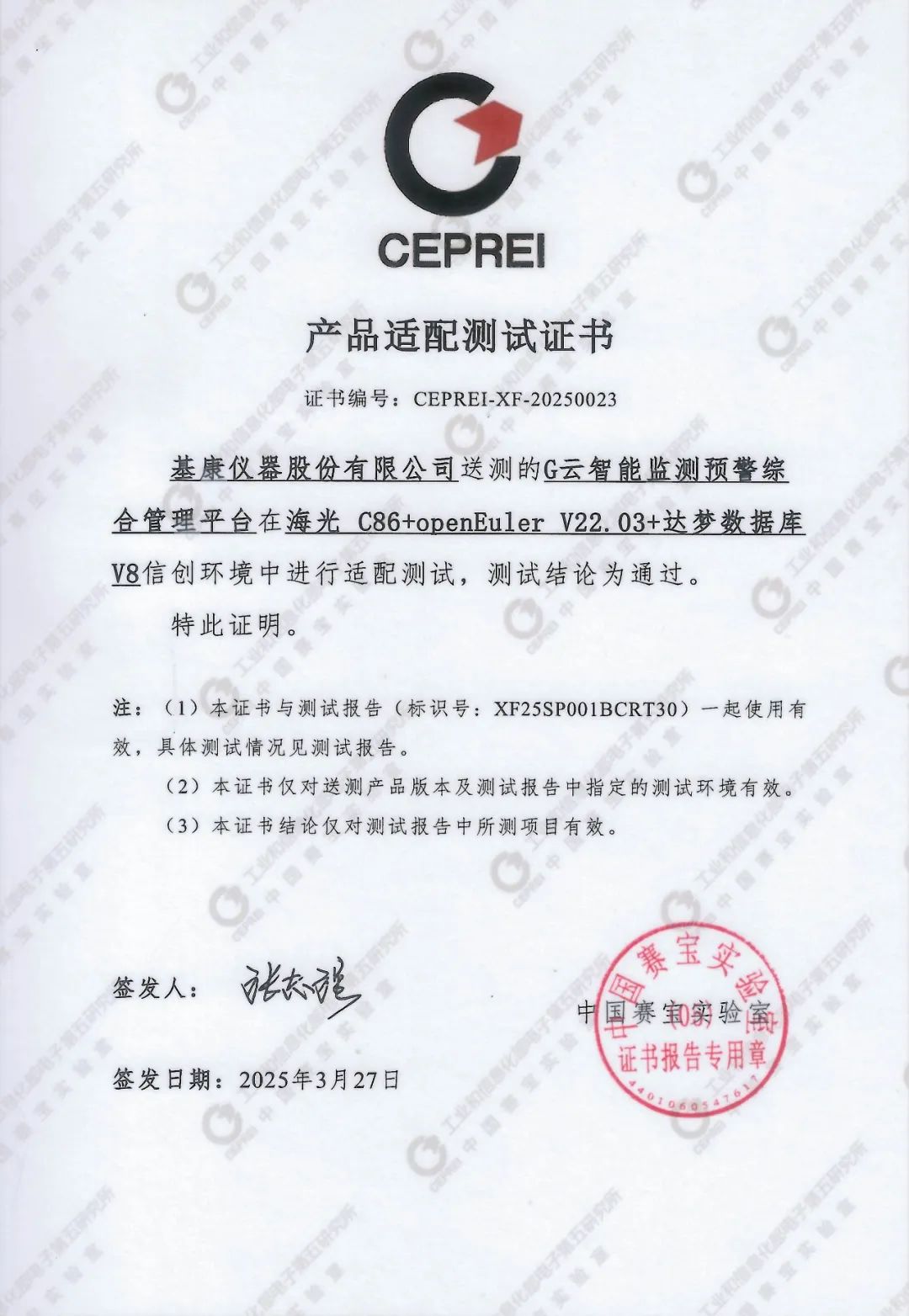 G云平台荣获国产信创适配认证证书基康仪器着力打造行业国产化云服务新标杆。