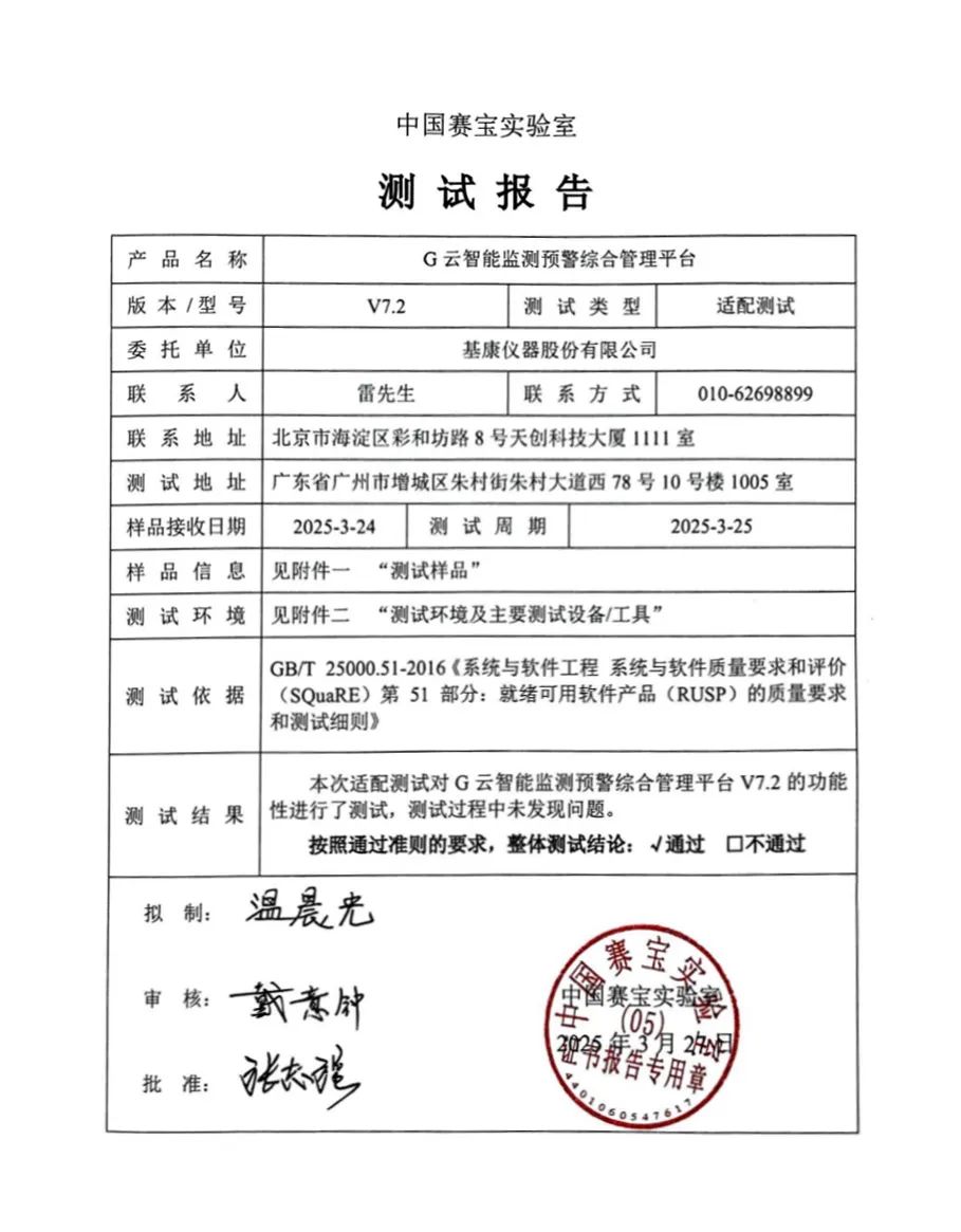 在信创产业加速推进的背景下,2025年3月27日,基康仪器股份有限公司G云平台正式通过工信部信息技术应用创新工作委员会权威认证,荣获《产品适配测试证书》。该证书的取得,标志了G云平台在建立国产化信息技术软硬件底层架构体系和全周期生态体系中的技术成熟度和安全性达到国家标准化要求,可为政企客户提供自主可控的云服务解决方案。