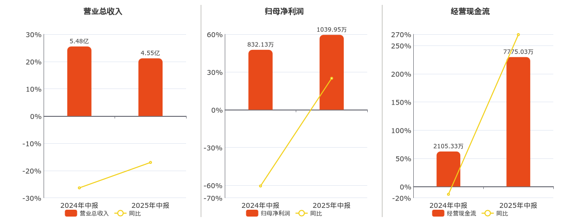 公司营业总收入为4.55亿元。归母净利润为1039.95万元,较去年同报告期归母净利润增加207.83万元,实现2年连续上涨,同比较去年同期上涨24.98%。经营活动现金净流入为7775.03万元,较去年同报告期经营活动现金净流入增加5669.70万元,同比较去年同期上涨269.30%。