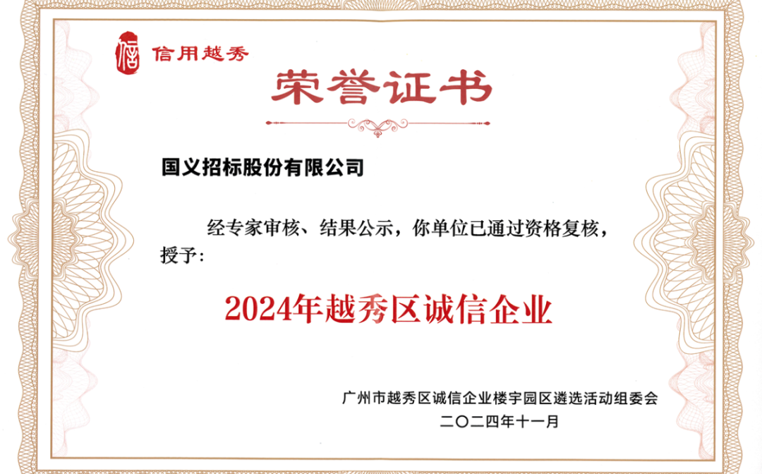 本次获评“诚信企业”,是对国义招标坚持守法经营、诚信发展的肯定,我们将持续提升本企业的社会信誉,共同擦亮“信用越秀”品牌名片。