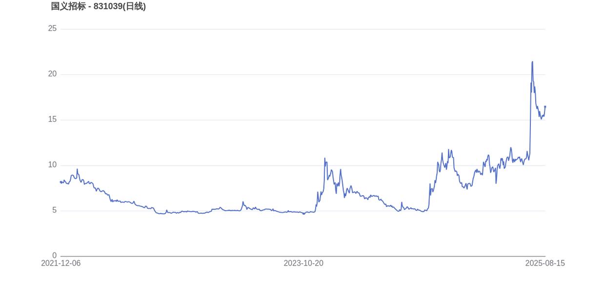 从上市首日至今,国义招标的市值实现了0.54倍的增长。2025年7月15日,国义招标的市值巅峰达到38.30亿元,股价也顺应升至24.9元。而至8月15日收盘,国义招标的股价为16.45元,市值为25.30亿元,相比峰值时期市值减少13.00亿元,市值蒸发了33.94%。