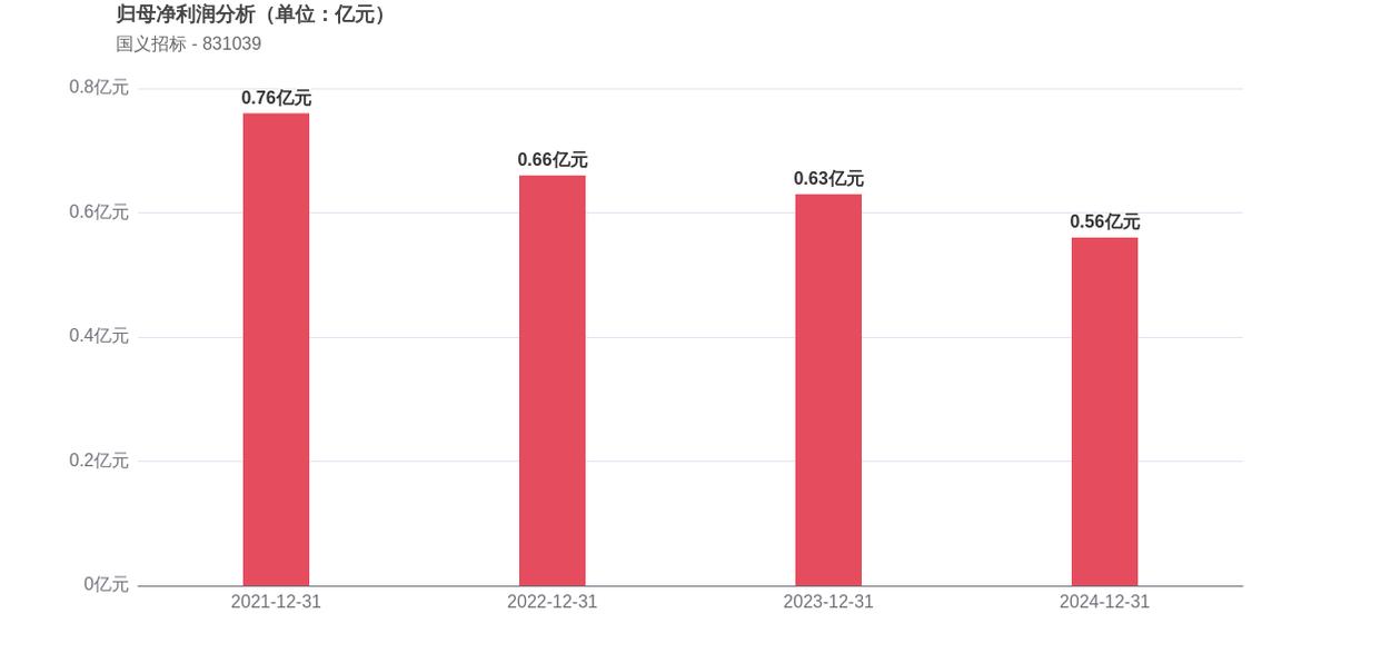 国义招标上市的2021年,当年实现归母净利润0.76亿元。截至最新完整财年的2024年,公司实现0.56亿元的归母净利润,近年累计下降了26.90%。这4年间,国义招标无一年份出现亏损。