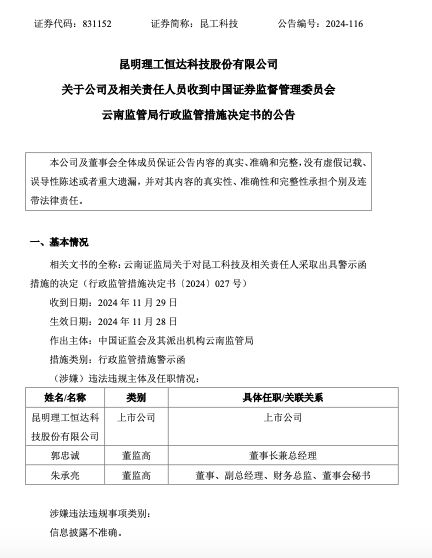 12月2日,昆明理工恒达科技股份有限公司(以下简称“昆工科技”或“公司”)发布关于公司及相关责任人员收到中国证券监督管理委员会云南监管局行政监管措施决定书的公告。公告称,因信息披露不准确,云南证监局决定对昆工科技和董事长兼总经理郭忠诚、财务总监兼董事会秘书朱承亮,采取出具警示函的行政监管措施。