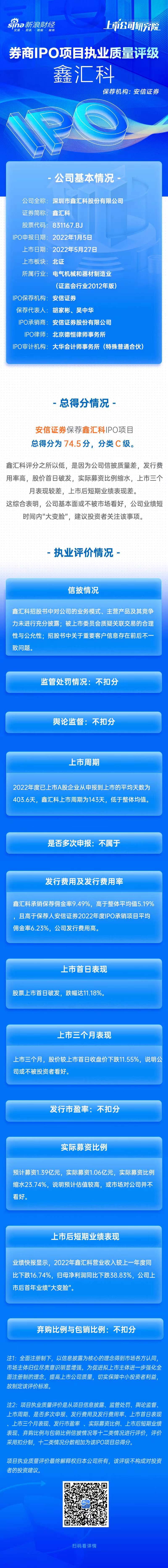 鑫汇科IPO项目总得分为74.5分,分类C级。鑫汇科评分之所以低,是因为公司信披质量差,发行费用率高,股价首日破发,实际募资比例缩水,上市三个月表现较差,上市后短期业绩表现差。这综合表明,公司基本面或不被市场看好,公司业绩短时间内“大变脸”,建议投资者关注该事项。