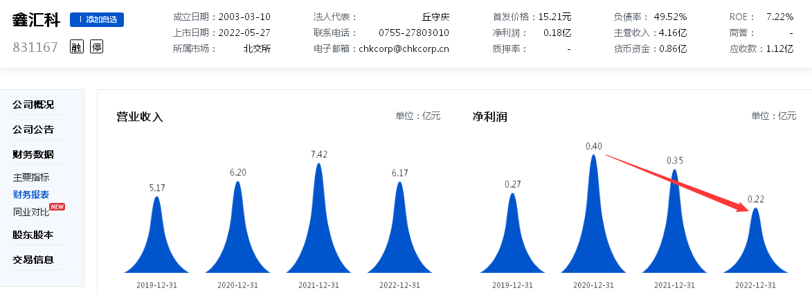 首先,从业绩上来看。2014年新三板挂牌后,鑫汇科终于在2022年5月27日成功在北交所上市。然而,上市后,业绩随即“变脸”。