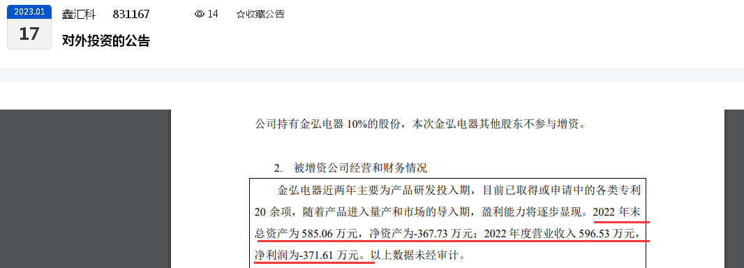 鑫汇科今年1月7日公告,为拓展产业链布局,公司拟以现金增资的方式投资中山市金弘电器有限公司(以下简称“金弘电器”),本次拟投资金额 300 万元人民币,投资后取得金弘电器 10%的股权。业绩方面,金弘电器2022 年末总资产为 585.06 万元,净资产为-367.73 万元;2022 年度营业收入 596.53 万元,净利润为-371.61 万元(以上数据未经审计)。