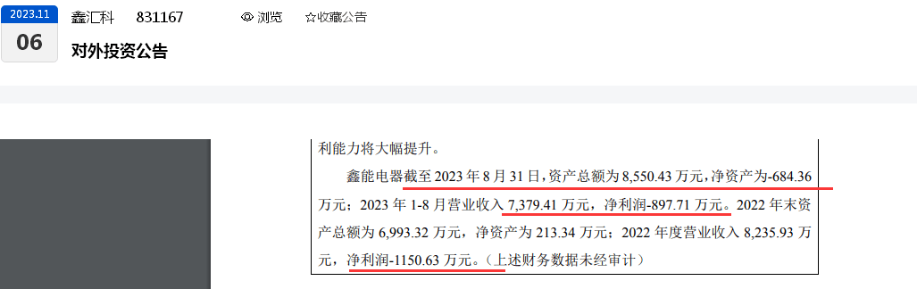 从财报数据来看,上述拟被投资对象鑫能电器不仅“亏损”、还处于“资不抵债”的状态。公开数据显示,盈利方面,鑫能电器2022年度、2023年1-8月份的净利润分别为:-1150.63 万元、-897.71 万元;净资产方面,鑫能电器2022年度末、2023年8月末的净资产分别录得:213.34 万元、-684.36万元(以上数据未经审计)。