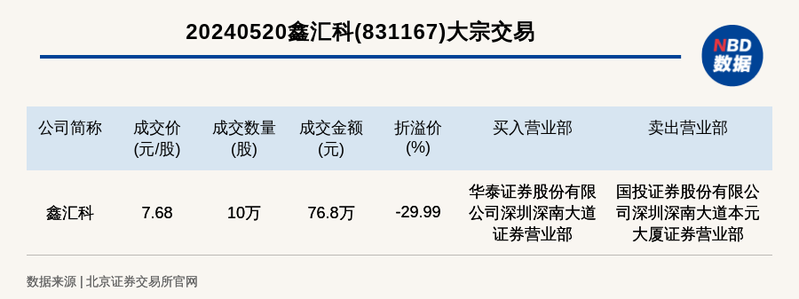 每经讯,2024年5月20日,北交所上市公司鑫汇科(831167,收盘价:10.97元)发生一笔大宗交易,成交价7.68元/股,成交数量10万股,成交金额76.8万元,折价29.99%。买入营业部是华泰证券股份有限公司深圳深南大道证券营业部,卖出营业部是国投证券股份有限公司深圳深南大道本元大厦证券营业部。