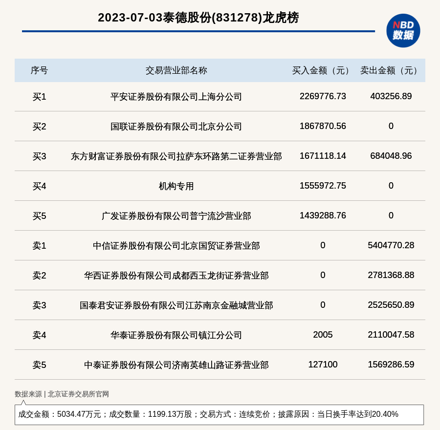 每经讯,2023年7月3日,北交所上市公司泰德股份(831278,收盘价:4.03元)登上龙虎榜,交易方式是连续竞价,披露原因是当日换手率达到20.40%,成交数量1199.13万股,成交金额5034.47万元。买一席位为平安证券股份有限公司上海分公司,买入226.98万元;卖一席位为中信证券股份有限公司北京国贸证券营业部,卖出540.48万元。