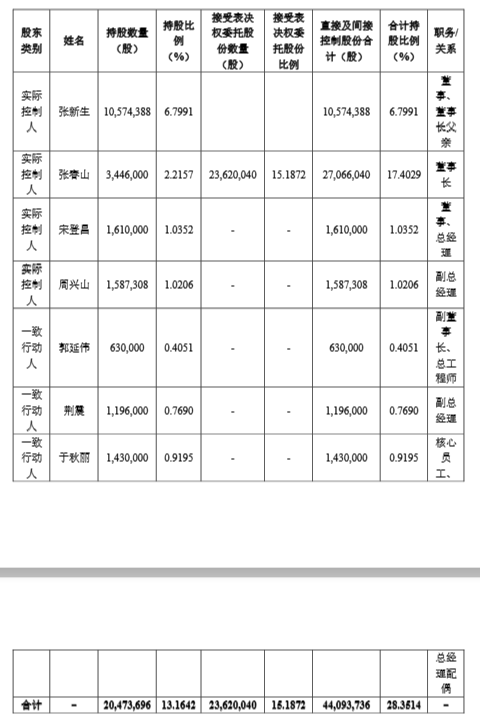 根据公告,公司实际控制人及一致行动人合计控制公司股份4409.37万股,占公司总股本的28.35%。其中,张春山直接持股2.22%,并通过委托控制15.19%表决权,合计控制表决权达17.40%。